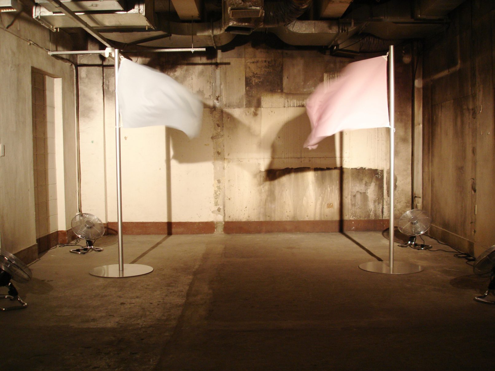 breeze – The Double statements / 2007 / 900×2700×2000mm / Flags, Steel, Fan