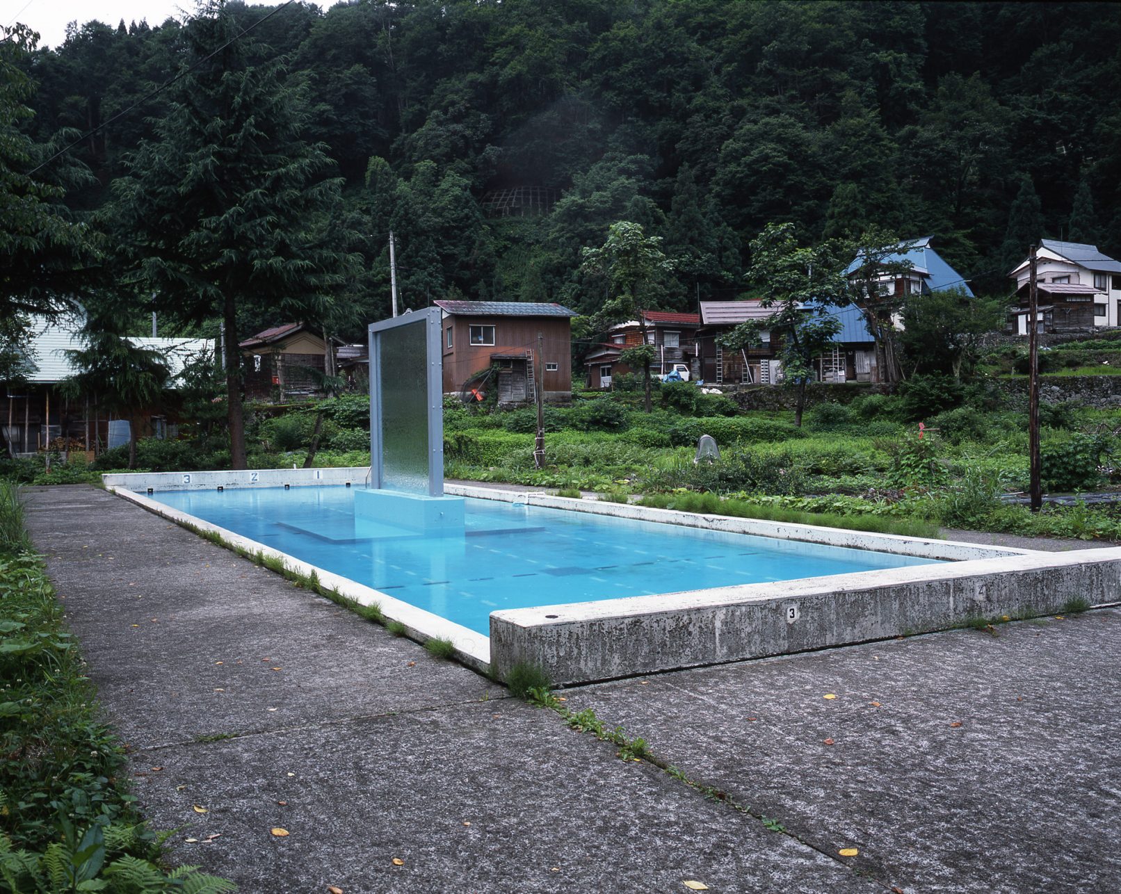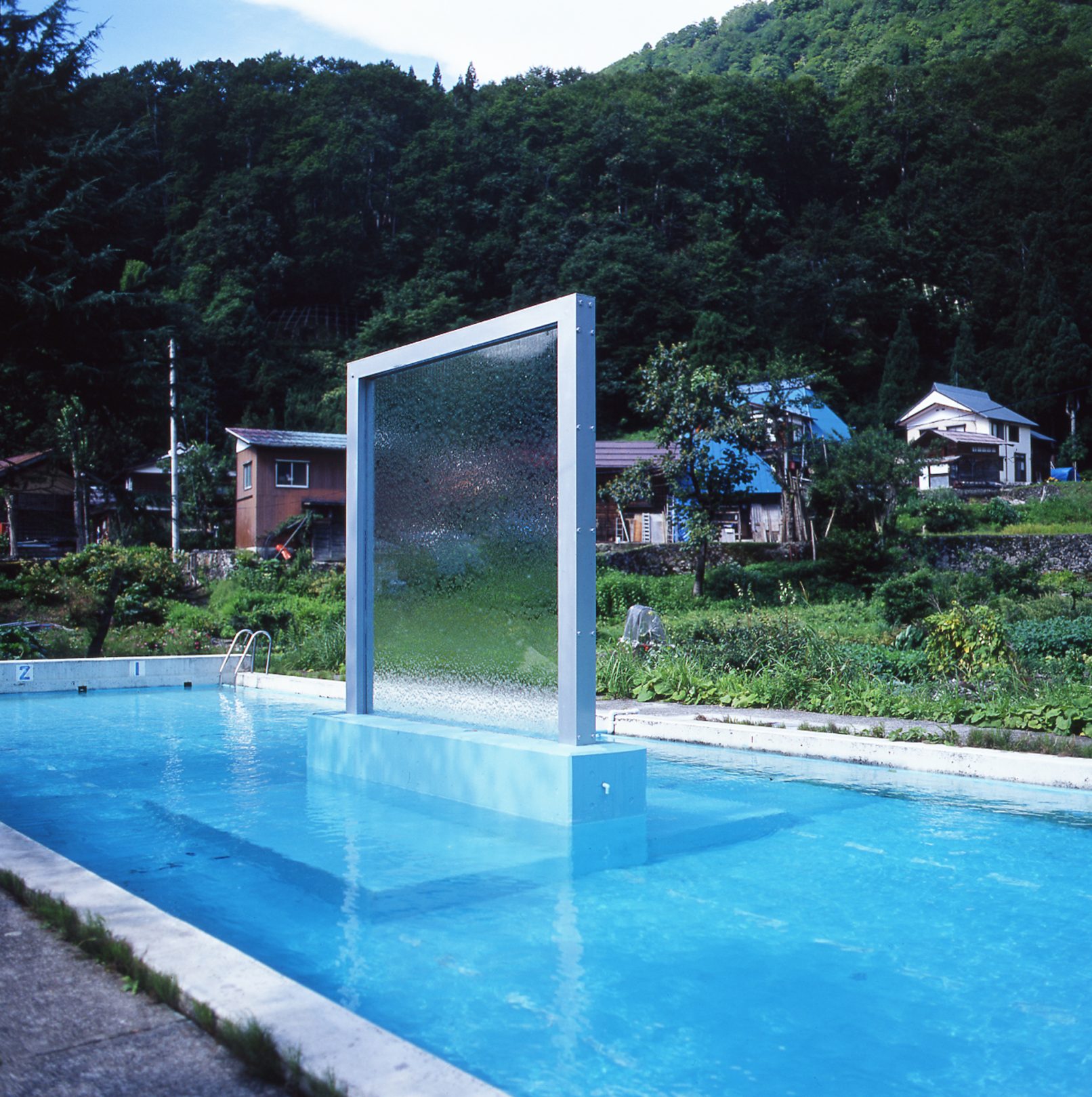 メルティングウォール / 2003年/ 3100×3100×H.4000 ,20000×5000×H.700mm(プール)/ プール、硝子、水、鉄、コンクリート/大地の芸術祭 越後妻有アートトリエンナーレ2003