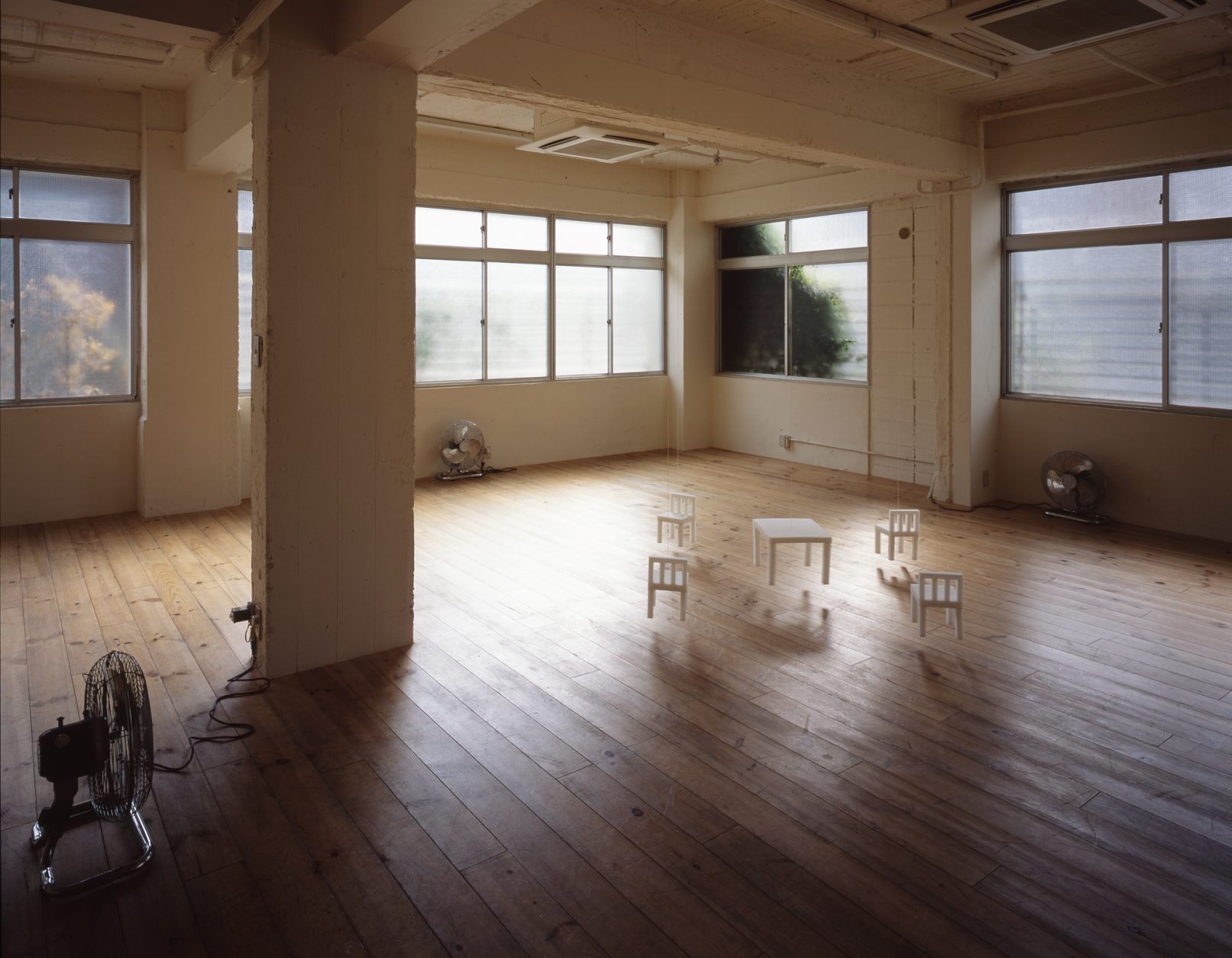 アラウンド / 2004年/ 机310×310×H.240㎜, 椅子170×170×H.270㎜/ スポンジ製のテーブルと椅子、糸、送風機、タイマー/ La Gallerie Des NAKAMURA