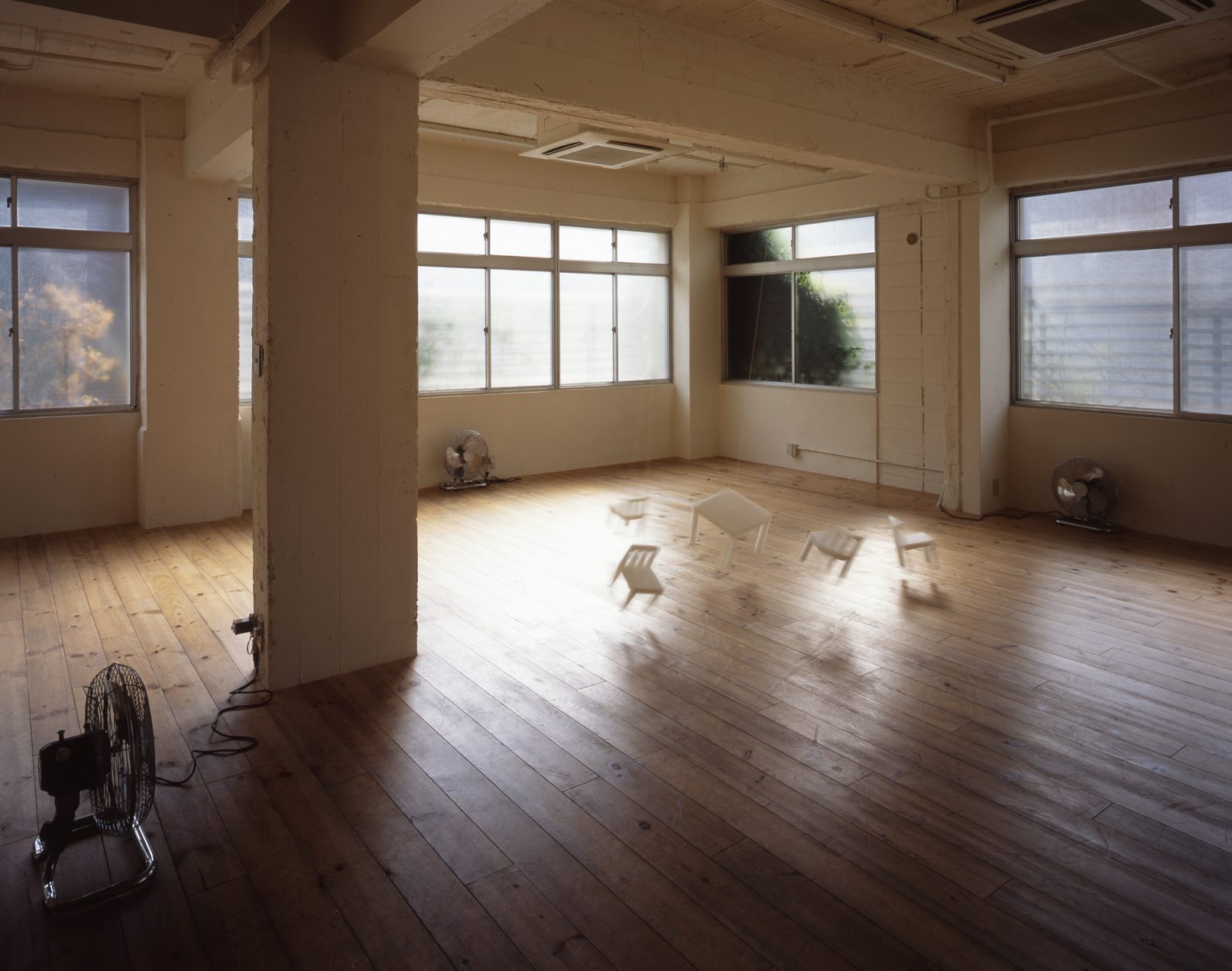 スポンジ製の小さな机と椅子が、四方から吹く風によって、激しく揺れては止まるを繰り返す風景。